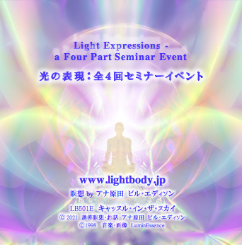 オンラインセミナーでご紹介するこの「光の表現」セミナーは、3弾前半「光の表現の道を発明する」セミナー受講者が対象です。ここでは、みなさんが、長期にわたって新たな光の表現を発展できるよう、ビルとアナや高次の存在達がお手伝いをします。次回の「光で変容する」4弾の『光として生きる:地上の世界を超えて生きる』セミナーのスペースをオープンにし、より深く入れる手助けとなりますが、セミナー参加条件ではありません。